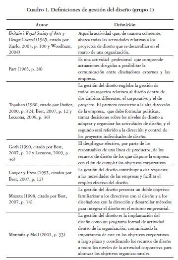 El grupo 1 reúne conceptos relacionados con la interacción diseño-empresa:Britain´s Royal Society of Arts y Design Council (1965), Farr (1966),Topalian (1980), Gorb (1990), Cooper y Press (1995), Mozota (1998),Montaña (2001), Hollins (2002), Naranjo, (2004), Leiro (2006) y Kootstra(2009). Estos autores aportan definiciones que evidencian la esenciadel surgimiento de la gestión del diseño, como respuesta a la necesidadde una disciplina que permita articular la concepción creativa del diseñocon criterios administrativos que faciliten su integración en las empresas.Por consiguiente, como herramienta dedicada a vincular de manera permanentey efectiva el diseño en la empresa, está directamente relacionadacon el lugar en el que se desarrollan los proyectos de diseño en las organizaciones,con la identificación de las áreas funcionales necesarias pararesolver los principales problemas de gestión desde el diseño y con lasherramientas que requieren los directivos en formación para utilizar losprocesos de diseño con eficacia.