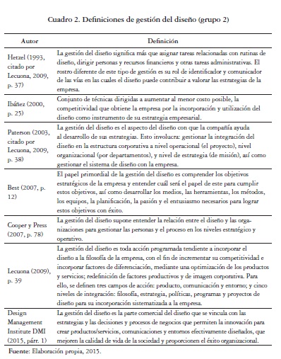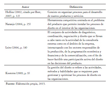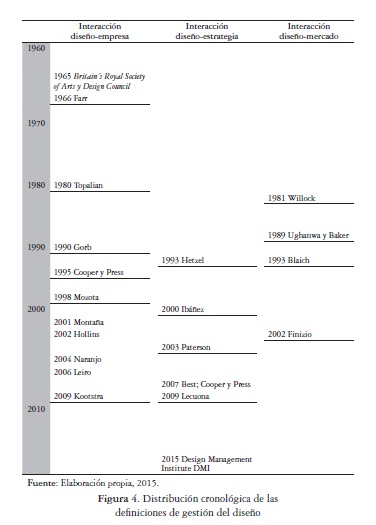 De las diferentes perspectivas sobre gestión del diseño enunciadas desde 1966 hasta la fecha, sobresalen por su contenido y alcance las determinadas por el Design Management Institute (DMI, 2014), Kathrym Best (2008) y Manuel Lecuona (2002), quienes la definen como una actividad dirigida a introducir el diseño en el ámbito estratégico de una empresa sobrepasando su impacto táctico y operativo5 para establecer objetivos