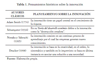 Esta idea sobre la innovación se ha venido formando desde los clásicos de la historia del pensamiento económico, sin una definición clara al inicio, pero sí concediéndole una importancia transcendental en el proceso de desarrollo económico, de generación de valor y de riqueza.