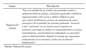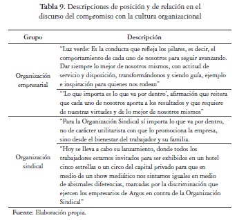En el grupo de la empresa, la definición de la identidad, actividades y propósitos se realiza en función de la organización como entidad, si se quiere totalizadora y en este orden auto referenciadora. En ese sentido, estos aspectos en relación con otros grupos los ejecuta, como se explicó en el apartado anterior, estableciendo un "ellos" y un "otros" con los colaboradores. No ocurre lo mismo en la organización sindical, la cual define la identidad, actividades y propósitos en relación con los grupos a los cuales opone: accionistas, administradores, directivos y que se explicó también en el apartado anterior. La posición de relación de la organización sindical es claramente contestataria y oponente al discurso empresarial, como se expresa en la ( Tabla 9).