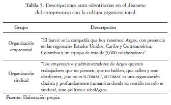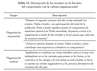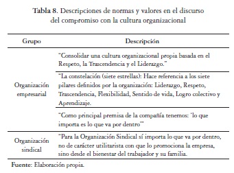 Para el grupo de la organización empresarial son cruciales las definiciones de valores acerca de lo que como empresa se considera bueno y correcto; no obstante, en el texto analizado no se ofrecen las definiciones de los valores Respeto, Trascendencia y Liderazgo. Igual sucede con los valores definidos como los siete pilares en el que se incluye también Trascendencia, connotando su importancia mediante refuerzo. La organización empresarial considera que mediante el despliegue y la consolidación de la cultura organizacional se alcanzan dichos valores, lo cual devela un yo y un ellos toda vez que los valores de la cultura se transfieren mediante las estrategias de las actividades y propósitos desde una entidad: la organización empresarial que no tiene rostro a "ellos": los colaboradores de esta que iguala. Un rol social para la organización empresarial consiste en alinear a sus colaboradores con los valores definidos para que "trasciendan", "mantengan la luz verde encendida", "sean virtuosos" y pongan todo ello a disposición para servirla. Por su parte, el discurso del grupo de la organización sindical establece las diferentes personas que intervienen en la organización empresarial: los accionistas, los empresarios, los directivos, los contratistas y los trabajadores y ubica la posición de desigualdad:"Aquí no se navega hacia el mismo norte, porque el estado de comodidad de los accionistas a bordo el barco no está dispuesto a ser compartido con los trabajadores". También ubica la reclamación de la violación de normas y valores: "La administración, al no poder conducir y controlar las actividades humanas, ante los conflictos que se presentan castiga de distintas formas, entre ellas los despidos, como ocurrió recientemente con..., a quien fueron a cazar a la planta calera..., cacería comandada por el jefe de mantenimiento quien en medio de la consolidación de una cultura de respeto a las personas, la trascendencia, la flexibilización y el liderazgo va en busca de su nueva presa".