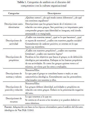 El análisis se realiza en dos niveles; se inicia con uno general de cada texto en el que se tienen en cuenta principalmente los elementos discursivos propuestos por Potter (1996). Posteriormente se realiza el análisis según las categorías descritas en la ( Tabla 1) que se encuentran definidas con base en los tópicos orientadores para el análisis del discurso ideológico de Van Dijk (1996). De igual forma, para la comprensión del discurso del compromiso de los empleados en la gestión de la cultura organizacional se tuvo en cuenta el enfoque de los estudios críticos de la administración antes expuestos como su base teorética.