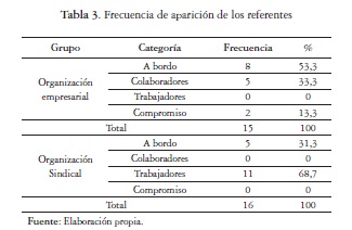 Se observa que se está frente a dos textos con discursos polarizados; en tanto la organización empresarial no reconoce los trabajadores como noción, la organización sindical hace lo propio con la palabra colaborador. De otra parte, si bien el evento a bordo es, en términos de frecuencia, importante para la organización sindical no es la que domina los referentes, en contraste con el grupo de la organización empresarial donde sí ocurre. En el texto del grupo sindicato domina la noción de trabajadores y se observa también que la palabra compromiso no se encuentra en el texto producido por esta organización.( Tabla 4)