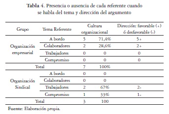 En concordancia con el indicio del punto anterior en relación con la polarización, aquí se encuentra que en el grupo de la organización empresarial todas las direcciones se establecen en sentido positivo, en contraste con la organización sindical donde todas las direcciones son negativas. De otra parte, en el grupo de la organización empresarial se encuentran los referentes a bordo y colaboradores en relación con el tema de cultura corporativa, en tanto hay ausencia del referente compromiso. Por su parte, en el grupo de la organización sindical la ausencia se encuentra en el referente a bordo y la presencia con los referentes trabajadores y compromiso. Cada grupo tiene presencia con su definición de identidad en la empresa pero el tema de cultura organizacional lo relacionan de manera diferente.