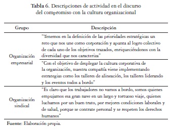 En estas descripciones cada grupo se autoidentifica en virtud de sus características: el de la organización empresarial pone de relieve la gran empresa que representa, y el de la organización sindical mediante la estrategia de aludir de primera mano a lo que no son. Ambas son positivas en relación con ellas mismas. En la estrategia discursiva de la organización empresarial prevalece la idea de grupo e inclusión: "la compañía que hoy tenemos". En contraste, en la estrategia de la organización sindical prevalece la exclusión del "otro" es decir de la empresa.( Tabla 6)