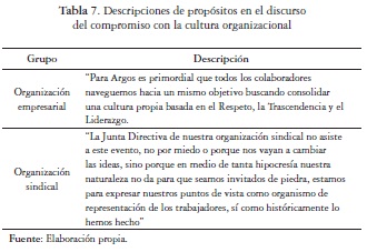 Cada grupo expresa los propósitos positivos de sus actividades; la organización empresarial busca consolidar una cultura que gira en torno a unos valores definidos por ellos mismos y con los cuales desean ser vistos. Por su parte, el sindicato plantea que su propósito es continuar representando a los trabajadores y no plegarse a la empresa, afirmando también que así es como quieren ser vistos y juzgados.( Tabla 8)