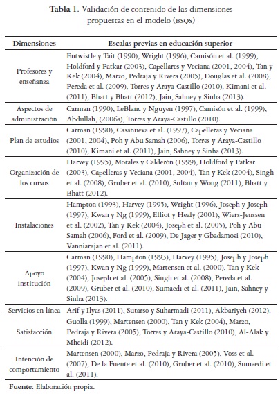 El modelo propuesto parte del supuesto de que la calidad de servicio en las escuelas de negocios es un constructo de naturaleza multidimensional (Torres y Araya-Castillo, 2010). A causa de esto, se propone el modelo BSQS, el cual está configurado por las siguientes dimensiones: 1. profesores y enseñanza, 2. aspectos de administración, 3. plan de estudios, 4. organización de los cursos, 5. instalaciones, 6. apoyo institución y 7. servicios en línea.