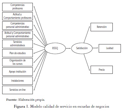 Considerando lo anterior, se propone el modelo de calidad de servicio en escuelas de negocios (BSQS), que se basa en una exhaustiva revisión de la literatura y de la aplicación de cuestionarios semiestructurados y el desarrollo de focus groups y entrevistas en profundidad a estudiantes, directivos y expertos en el área. Como resultado, se concluye que el constructo BSQS es multidimensional, y está compuesto por las dimensiones: 1. competencias de los profesores, 2. actitud y comportamiento de los profesores, 3. competencias del personal administrativo, 4. actitud y comportamiento personal administrativo, 5. servicios administrativos, 6. plan de estudios, 7. organización de los cursos, 8. apoyo a la institución, 9. instalaciones y 10. servicios en línea. Asimismo, se propone una relación positiva entre el constructo BSQS y el grado de satisfacción de los estudiantes, y una relación positiva entre el grado de satisfacción de los estudiantes y sus intenciones de retención, lealtad y disposición a pagar.