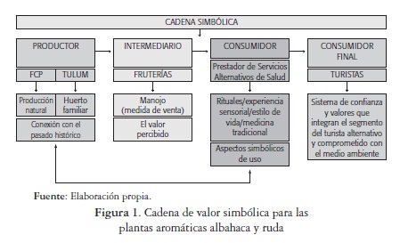 La cadena de valor simbólica representa aquellos elementos culturales inmersos en el canal de comercialización. El canal está compuesto por productores, intermediarios y consumidores. En ese contexto, es interesante e importante identificar los elementos simbólicos del canal. Se puede decir que los productores de la albahaca y la ruda, identificados en Felipe Carrillo Puerto, realizan una producción natural (manejo agroecológico) y en Tulum mediante el huerto familiar. En este sentido, la cultura de conservación documentada para los mayas está inmersa en las formas de producción agroecológicas, que representa la conexión con el pasado histórico de la producción agrícola de la zona. Por otra parte, se encuentra el intermediario, que emplea un mecanismo de venta a manojo (unidad de intercambio de un bien, que no tiene una definición en el sistema métrico decimal), que no establece una unidad de medida de los productos y que es empleada de acuerdo con el valor percibido de las partes involucradas vendedor-comprador. Este elemento ya ha sido identificado en otras investigaciones realizadas por Páramo y Ramírez (2011a). Finalmente, se determina al consumidor, que en el canal actúa como el decisor y el comprador, quien emplea el producto (ruda y albahaca) para la realización de rituales, a través de los aromas que desprenden estás plantas generadoras de la experiencia sensorial, inmersos en el estilo de vida y la práctica de la medicina tradicional o herbolaria, que representa simbólicamente un artefacto que conduce a propiciar aspectos simbólicos de uso e identidad.