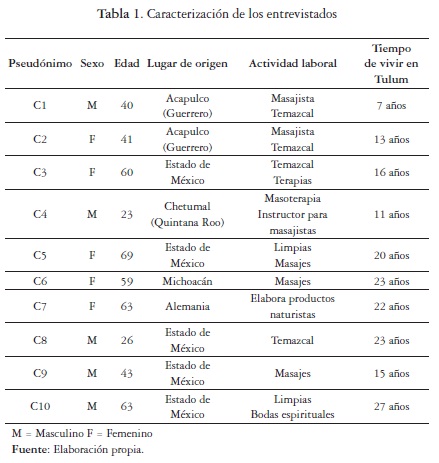 La mayor parte de las personas entrevistadas son del centro de México, cinco hombres y cinco mujeres. En las actividades laborales que desarrollan, se observa que la mayoría realiza más de una actividad vinculada como prestadores de servicios alternativos de salud, es decir que ofrecen más de un servicio al turista (tabla 1).