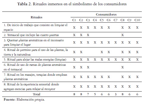 Uno de los aspectos simbólicos identificados donde son empleadas las plantas aromáticas, la albahaca y la ruda, son los rituales que realizan los prestadores de servicios alternativos de salud en las actividades (rituales) previas, durante y después del servicio que ofrecen a los turistas. Las actividades identificadas con el uso de las plantas son las siguientes: 1. preparación e inicio de trabajo, que consiste en limpiar el espacio; 2. temazcal que incluye las cuatro puertas (que se refiere a las cuatro veces que se introducen las piedras calientes al temazcal); 3. quemar plantas aromáticas en el incensario para limpiar el lugar; 4. ritual de petición de permiso, para el uso de las plantas, a la tierra y la naturaleza; 5. ritual para alejar las malas energías (limpias); 6. ritual de uso de ramas de plantas aromáticas en el temazcal; 7. ritual en los masajes, terapias donde emplean plantas aromáticas (tabla 2).