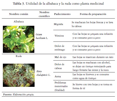Otro elemento identificado es la utilización de la albahaca y la ruda como medicina tradicional (herbolaria), la cual, en algunas ocasiones, es recomendada por ellos en enfermedades como migraña, dolor de cabeza, y las que se mencionan en la tabla 3.