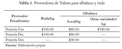Actualmente, se identifican tres proveedores importantes en Tulum (tabla 4), los cuales se presentan con los siguientes pseudónimos: 1. Frutería Uno, 2. Frutería Dos y 3. Frutería Tres. Los precios establecidos son los siguientes: