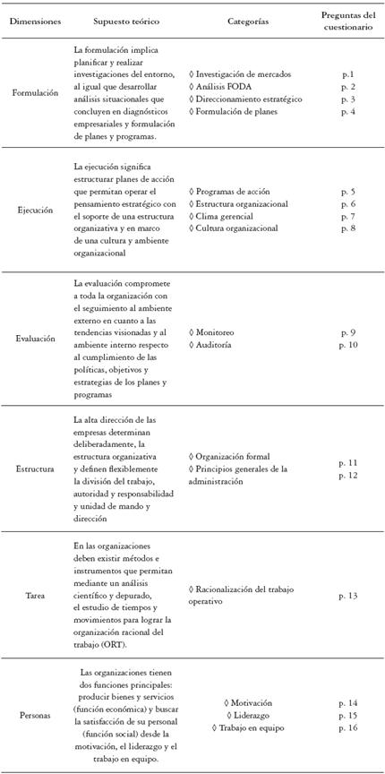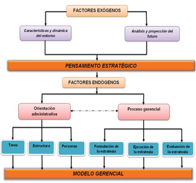 Para analizar las relaciones entre el pensamiento estratégico y los modelos gerenciales se considerarán ocho dimensiones. A nivel exógeno, las características y la dinámica del entorno y el análisis y la proyección del futuro, y a nivel interno, se tendrán en cuenta la formulación, ejecución y evaluación de la estrategia (del proceso gerencial) y las tareas, estructura y personas (orientación administrativa), de la siguiente manera: