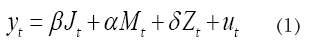 Donde yt es el vector que contiene la tasa de crecimiento del producto interno bruto per cápita, J es la matriz de variables socioeconómicas, las cuales siempre se incluyen en la regresión, Mt matriz que contiene las variables de interés y Zt es una matriz que incluye las variables de capital humano importante en la explicación del crecimiento económico y por último Ut que es el término de error.