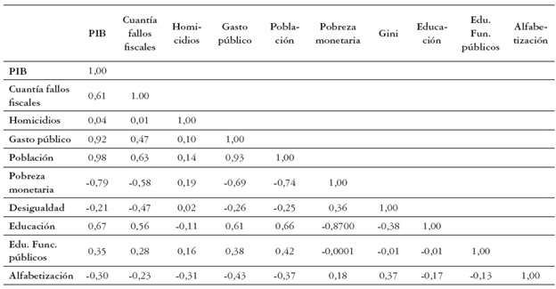 Por ejemplo, la correlación entre la cuantía de los fallos fiscales y el PIB sugiere que, al aumentarse la corrupción aumentaría el PIB, igual sucede con el número de homicidios. En el caso de la tasa de alfabetización, sugiere que un aumento de la alfabetización reduciría el PIB departamental, algo que puede no tener ningún sentido. Similar en las relaciones entre la cuantía de los fallos con la pobreza o la desigualdad. En este sentido, se esperaría que incrementos en la corrupción podrían disminuir la pobreza y la desigualdad.