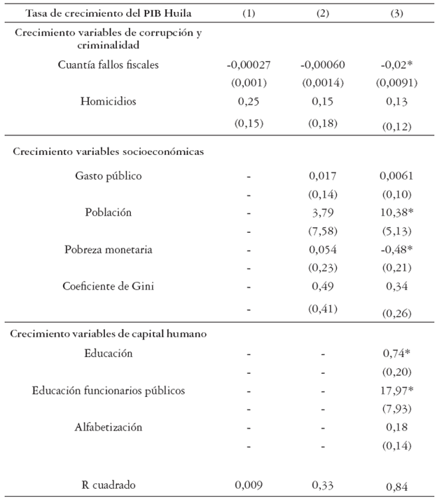Las estimaciones muestran para los tres modelos, que un incremento en la tasa de crecimiento de la cuantía de los fallos fiscales, reduce la tasa de crecimiento del PIB departamental; no obstante, este efecto es creciente a medida que se controla por más variables. Para el segundo modelo, solo se controla por variables socioeconómicas, corrupción y criminalidad, de tal forma que un incremento en la tasa de crecimiento en la cuantía de los fallos fiscales tiene un efecto del -0,17% en la tasa de crecimiento de la producción en el departamento del Huila; entre tanto, en el tercer modelo, el cual controla por variables de capital humano, indica que un aumento de 1% en la tasa de crecimiento de la cuantía de fallos fiscales, reduce el tasa de crecimiento del PIB departamental alrededor de 2,9%. Este comportamiento en el resultado es esperado, y coincide con lo señalado por Ehrlich (1999), al afirmar que la corrupción genera una disminución en los recursos que pueden utilizarse en la producción e inversión y en el capital humano productivo, factores fundamentales para el crecimiento económico.