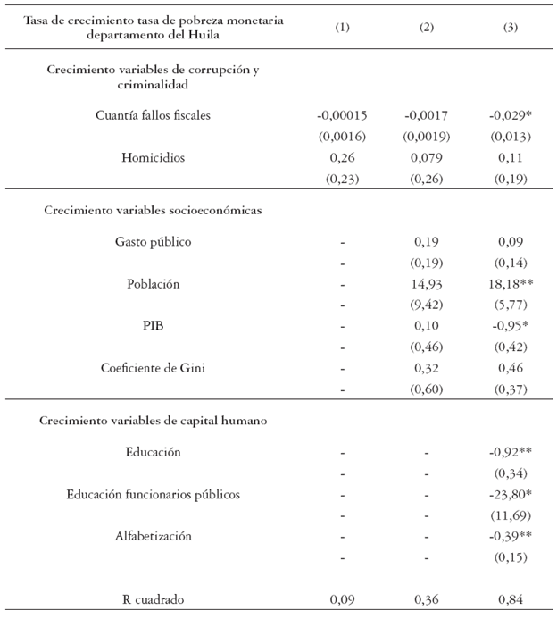 Con respecto a la corrupción, esta variable representada por la tasa de crecimiento del valor de cuantía de los fallos fiscales en el departamento del Huila, tiene un efecto positivo y negativo con respecto al crecimiento del PIB departamental y a la pobreza monetaria respectivamente. Sin embargo, estos efectos son significativos a medida que se utilizan más variables explicativas como posibles controles, tales como corrupción, criminalidad, socioeconómicas y capital humano (educación, educación de los funcionarios públicos). Es bajo este escenario que un aumento de la corrupción (cuantía de los fallos fiscales) reduce el crecimiento económico, permitiendo inferir que un incremento del 1% en la tasa de crecimiento en la cuantía de los fallos de responsabilidad fiscal, disminuye en 2% la tasa de crecimiento del PIB del departamento.