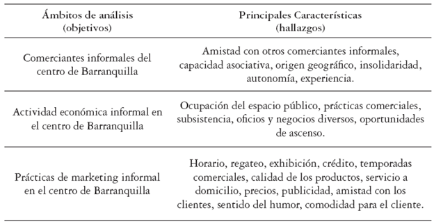 For this, a qualitative methodology is developed based on ethnography and grounded theory. The findings enable to describe and understand informal commerce in Barranquilla's downtown, from three areas of analysis: Informal traders, informal economic activity and informal marketing practices.