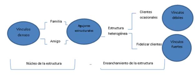 Atendiendo a que el capital social -relaciones, vínculos y lazos- conduce a la obtención de recursos para los individuos y grupos, se encontró que el ingreso de las 63 mujeres a la actividad informal del manicure es motivada por necesidades de orden económico; para estas mujeres el punto de inicio o plataforma desde la cual es posible conectar con clientes y cimentar su red de contactos nuevos son los amigos y familiares. Estas primeras conexiones nacen fruto de la solidaridad y/o creencia en sus habilidades. Adicionalmente, las mencionadas conexiones facilitan a otros contactos el conocimiento de la experiencia de los servicios de su familiar o amiga, la manicurista (ver figura 1).
