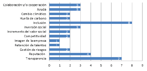 Las referencias asociadas al concepto de RSE -colaboración y cooperación, ayuda, inversión social, inclusión- resultan compatibles con el hecho de que en todos los reportes se alude a acciones desarrolladas en la comunidad. En este sentido llama la atención que en ningún caso se mencionan mediciones de impacto social, mecanismo utilizado para ponderar la efectividad de las acciones realizadas en el campo social. Es factible que la utilización del término inclusión en mayor proporción que los demás se vincule con el extendido uso que se le dio en los últimos años como transtema de muchas políticas gubernamentales. También se hallaron términos asociados a lo que se denomina justificación económica de la RSE -imagen de la empresa, retención de talentos, gestión de riesgos-, pero en ningún caso se hizo referencia a la protección de la cotización bursátil o al incremento de las utilidades como conceptos utilizados para justificarla.