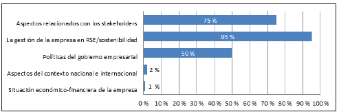 Aspectos relacionados con los stakeholders Lagestión de la empresaen RSE/sostenibilidad Políticas del gobierno empresarial Aspectos del contexto nacional e internacional