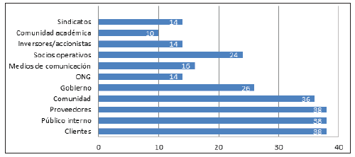 De los stakeholders indicados en la figura 7, y que en menor medida se mencionan, merecen ser destacados 3 de ellos. Uno es el de los sindicatos; por el tamaño de las empresas generadoras de los reportes no puede desconocerse en ellas la existencia de actividad sindical, ni la importancia y fortaleza que los sindicatos tuvieron y tienen en la República Argentina, especialmente en las grandes empresas. A priori podría suponerse que es un grupo de interesados en que las empresas no podrían ni deberían ignorarlos en función de los atributos que poseen. El segundo caso llamativo es el de la comunidad académica; la poca cantidad de menciones es un indicativo de la poca colaboración estratégica existente entre aquella y las empresas. Por último en el caso de las ONG también se aprecia la escasa vinculación. De los reportes surge que la relación empresa-ONG se verifica casi exclusivamente en actividades empresarias de intervención en la comunidad, en las que las ONG actúan como socios estratégicos poseedores de la experticia específica en temas del campo social de la que carecen las empresas.