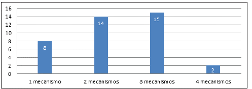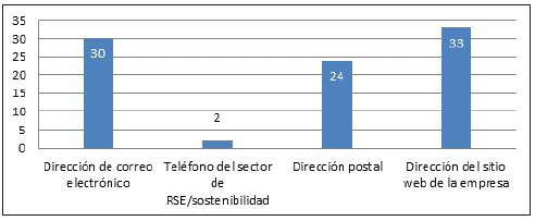 Solo un reporte no presenta ningún mecanismo de retroinformación; en los demás se encontraron exclusivamente los siguientes: dirección de correo electrónico -institucional o del sector responsable del reporte-; teléfono del sector de RSE-sostenibilidad; dirección postal de la empresa; dirección del sitio web. Los reportes presentan desde 1 hasta 4 de ellos, y son mayoría los que presentan 2 y 3 mecanismos, tal como se muestra en la figura 8.