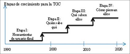 Gottschalk (2006) propone cuatro fases de crecimiento de la tecnología para la gestión del conocimiento (TGC): La primera etapa es en general de soporte de TI para los trabajadores del conocimiento. Esto incluye el procesamiento de textos, hojas de cálculo y correo electrónico. La segunda etapa es la información acerca fuentes de conocimiento. Un sistema de información almacena información acerca de quién sabe qué dentro y fuera de la empresa. El sistema no almacena lo que realmente saben. Un ejemplo típico es la intranet de la empresa. La tercera etapa es la información que representa el conocimiento. El sistema almacena lo que los trabajadores del conocimiento conocen en términos de información. Un ejemplo típico es una base de datos. La cuarta, y última etapa, es el procesamiento de la información. Un sistema de información utiliza la información para evaluarlas situaciones. Un ejemplo típico aquí es un sistema experto.