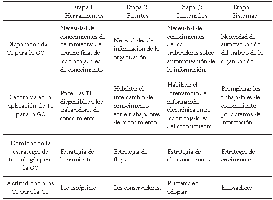 El enfoque de la tecnología orientado desde la madurez de la GC sirve para identificar los pasos siguientes en el desarrollo tecnológico, a fin de avanzar hacia el estado de las tecnologías futuras que apoyarán los procesos de GC. Por lo tanto, de acuerdo con la etapa de GC en la que se encuentre la organización, así va a cambiar el disparador de TI, el enfoque en la aplicación de TI, la estrategia de tecnología para la GC y la actitud hacia las TI.