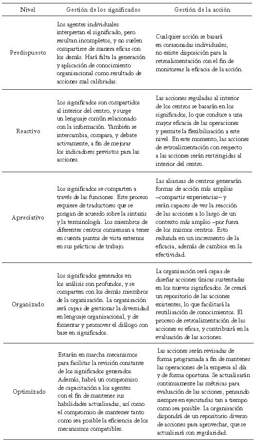 Una propuesta de este tipo de modelos (Desouza, 2006) está conformada por 5 niveles o etapas para evaluar los esfuerzos en GC de la organización, cuya madurez puede describirse en una escala progresiva: predispuesta, reactiva, apreciativa, organizada y optimizada. Los 4 componentes de GC, que se asemejan a las áreas clave mencionadas en los modelos funciona-listas de madurez de GC son: gestión de las fuentes, gestión analítica, gestión de los significados y gestión de la acción. Debido a que las dos primeras áreas en su conceptualización son redundantes con las áreas clave de los modelos funcionalistas de GC, entonces se ha completado la perspectiva conceptual integrando una cuarta área clave que se denominará interpretativa, conformada por las dos últimas categorías, es decir, gestión de los significados y gestión de la acción.