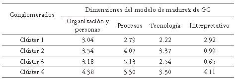 Este procedimiento se deja en este punto, para dar inicio al análisis clúster que busca clasificar las observaciones de acuerdo a su grado de homogeneidad e identificar los rangos de los 5 niveles de la escala de madurez; para ello se aplicó la técnica no jerárquica K-means, que resulta pertinente cuando se conoce de antemano el número de grupos o conglomerados. En este caso, se usó la versión 20 del SPSS agrupando las observaciones en 4 conglomerados, porque se asume que ninguna de las empresas se encuentra en un nivel inicial dado que el estudio se realizó con aquellas que han implementado iniciativas de gestión de conocimiento por lo menos con 5 años de antigüedad.