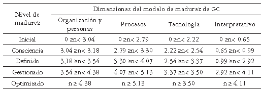 Ninguna organización de la población objeto de estudio está totalmente en el nivel inicial o en el nivel optimizado de madurez de la GC. Lo primero, porque el estudio utilizó como criterio que las empresas tuvieran algunas iniciativas relacionadas con la GC, y lo segundo, porque todas las organizaciones tienen actividades por mejorar, en al menos un área clave de GC. Solo 3 empresas están totalmente en el nivel consciencia (casi el 10 %). El 42 % de ellas, en el nivel definido y el 48 %, en el nivel gestionado (según tabla 9).