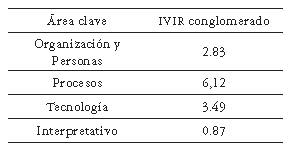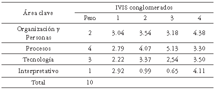 En la tabla 4 se presenta la matriz transpuesta con los resultados de los IVI para las 4 dimensiones del modelo de madurez de GC, y obtenida mediante el análisis clúster.