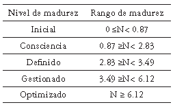 Lo anterior sirve de base para estimar los rangos de los 5 niveles de la escala de madurez (ver tabla 5), y determinar en cuál se encuentran las empresas, al ubicar en alguno de ellos el IVI de las 4 dimensiones.