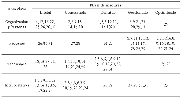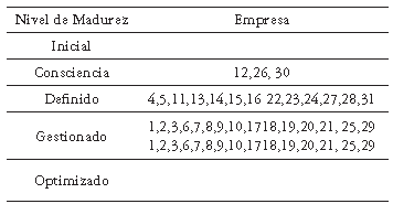 Comparando tabla 8 y los IVIR del anexo 2, se obtiene la ubicación de las 31 empresas en los 5 niveles de madurez (tabla 9)
