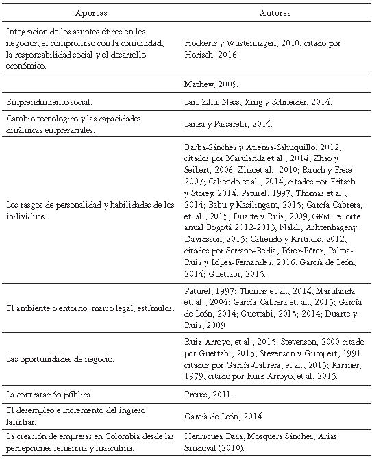 De la revisión teórica sobre la motivación en el emprendimiento realizada por Marulanda et al. (2014), se concluye que el proceso de creación de empresas está determinado, en primer lugar, por la percepción del individuo con respecto a sus objetivos y capacidades a nivel interno: la educación (Babu y Kasilingam, 2015; García-Cabrera, et. al., 2015; Duarte y Ruiz, 2009; GEM: reporte anual Bogotá 2012-2013), capital y cultura emprendedora (Naldi, Achtenhagen y Davidsson, 2015; Caliendo y Kritikos, 2012, citados por Serrano-Bedia, Pérez-Pérez, Palma-Ruiz y López-Fernández, 2016; Duarte y Ruiz, 2009; García de León, 2014; Guettabi, 2015), que podrían considerarse como las competencias empresariales, y, por otro lado, están los factores externos: características demográficas, económicas, la estructura industrial de las comunidades, demanda potencial y proximidad a los mercados (García-Cabrera, García Soto y Días-Furtado, 2015; García de León, 2014; Guettabi, 2015; Thomas et al., 2014; Duarte y Ruiz, 2009).