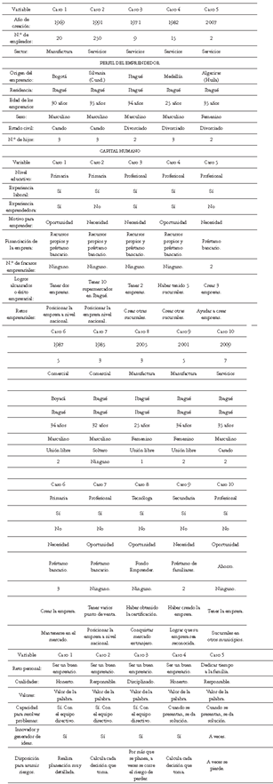 En lo referente al perfil del emprendedor, se analizaron variables relacionadas con el origen, residencia, edad, sexo, estado civil y número de hijos. En lo concerniente al capital humano se estudiaron variables como nivel educativo, experiencia laboral, experiencia en cuanto emprendedor, logros, retos, cualidades, valores, fuentes de financiación de la empresa, motivos para emprender, innovación y capacidad para asumir riesgos.