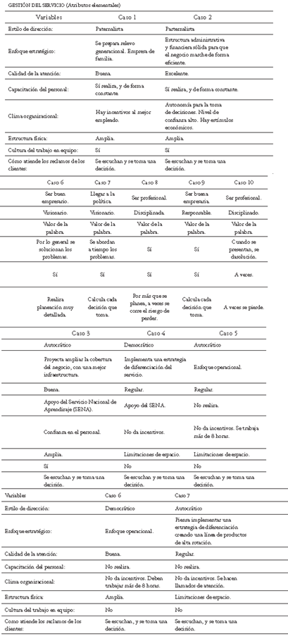 De acuerdo con el marco teórico planteado se extrajeron los atributos señalados por los diferentes autores y que, según ellos, deben poseer los directivos empresariales, con el fin de contrastarlos con los diez empresarios seleccionados para conocer sus rasgos distintivos. A continuación, se presenta una descripción de las características asociadas al perfil de los empresarios entrevistados en el momento de crear la empresa y sus prácticas de gestión del servicio (tablas 3, 4 y 5).