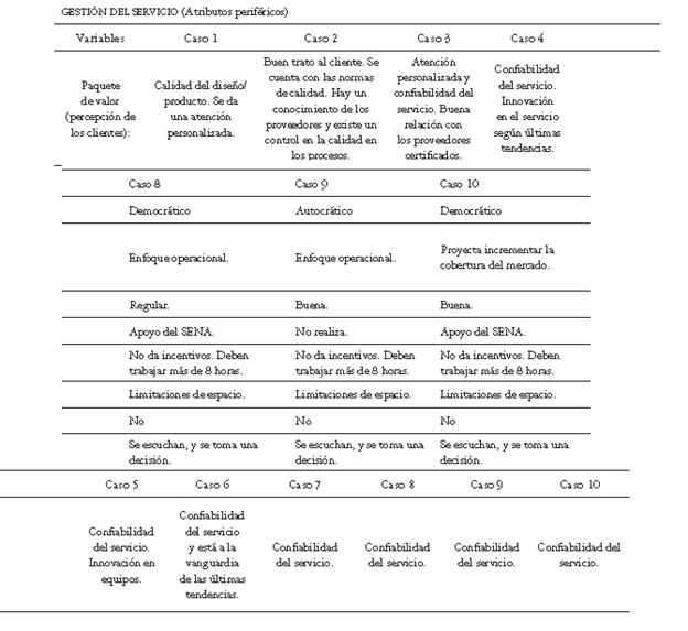 Finalmente, con respecto a la gestión del servicio se analizaron entre otras variables: los atributos pivote, los cuales están relacionados con la salida de la prestación del servicio, es decir, lo que el cliente espera alcanzar. Atributos básicos, los cuales hacen referencia a las personas, procesos y estructura organizativa con las que el cliente debe interactuar y negociar para alcanzar y recibir los atributos clave. Los atributos periféricos, que se relacionan con las cosas pequeñas o bonificaciones adicionales que vienen con los grandes beneficios, y que los convierte en una experiencia atractiva.