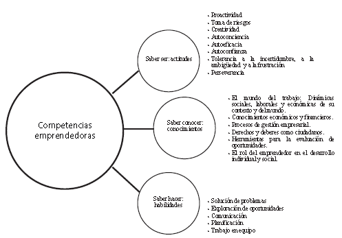 En este sentido, cuando se habla de competencias emprendedoras autores como Man, Lau y Chan (2002) las definen como "la capacidad total del emprendedor para desempeñar su rol de una manera exitosa y abarcan rasgos de personalidad, habilidades y conocimiento" (p. 124). Asimismo, retomando entre otros autores a Johannisson (1993), Chandler y Hanks (1994), Erikson (2002), Markowska (2011), es posible plantear las competencias emprendedoras como el conjunto de habilidades desarrolladas en función de identificar oportunidades y condiciones que generan acciones para consolidarlas como una realidad en función de sus objetivos propuestos. Lo anterior, a partir del reconocimiento de las actitudes, valores, motivaciones, destrezas y conocimientos que posee como individuo, así como su aprovechamiento para crear intencionalmente las condiciones necesarias a fin de cumplir tales objetivos.