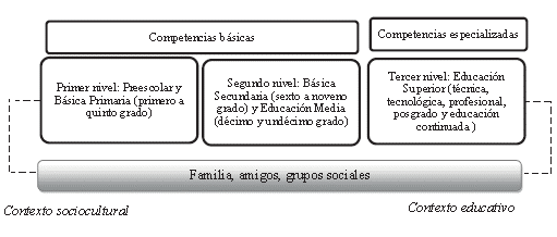 4) Las competencias emprendedoras se enmarcan en dos categorías: las competencias básicas y las competencias especializadas. Las competencias básicas son aquellas que construye el individuo a temprana edad y que constituye el soporte para emprender en cualquier ámbito. Las competencias especializadas son habilidades y conocimientos específicos para la formalización y consolidación de iniciativas de emprendimiento; estas se adquieren en etapas avanzadas de formación (ver figura 2).