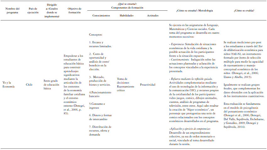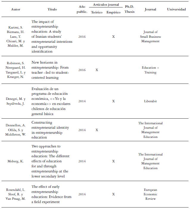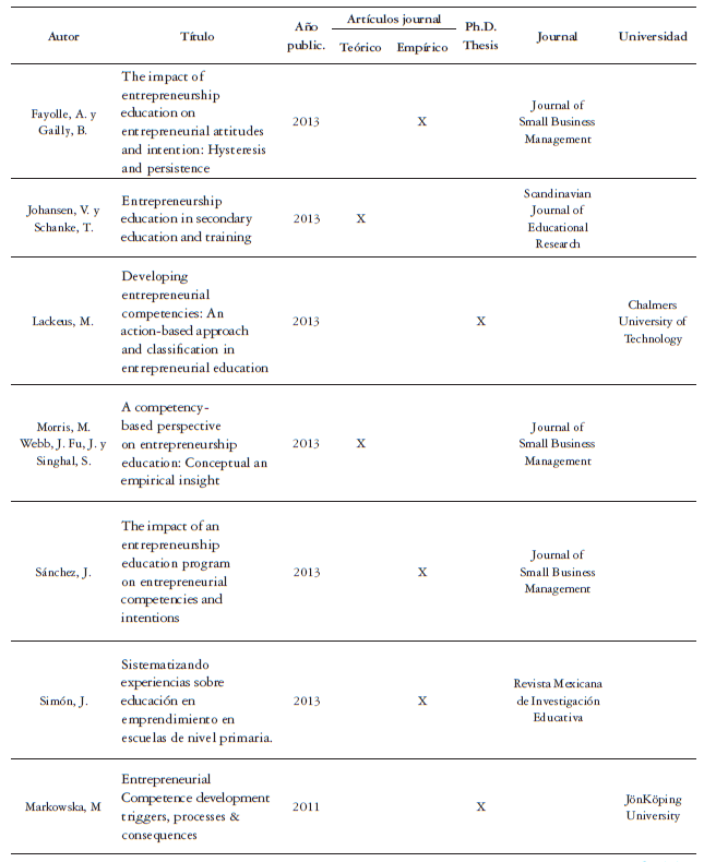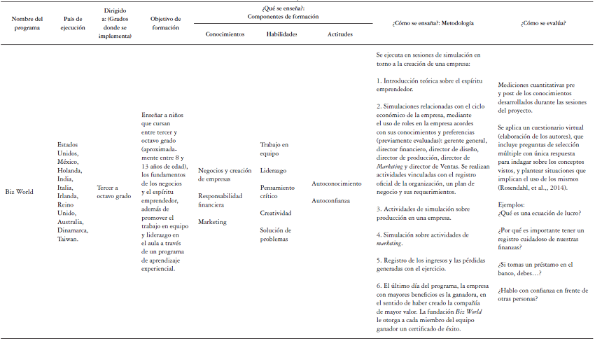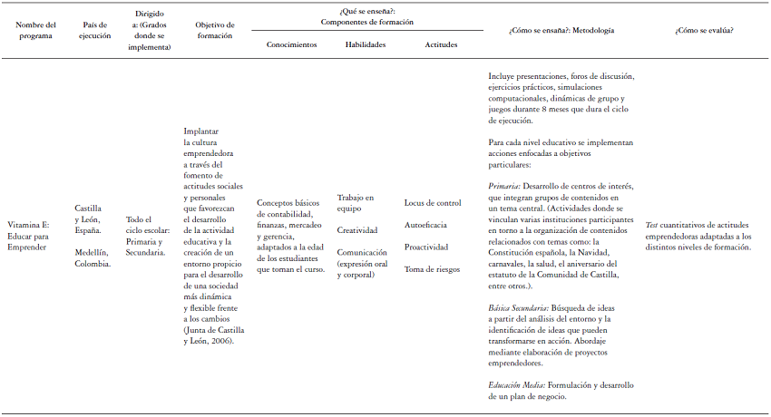Basados en los lineamientos identificados, en la literatura científica es posible encontrar informes sobre el diseño, implementación y evaluación de programas educativos orientados a la formación de competencias emprendedoras. Algunos de ellos (European Commission, 2013; Simón, 2013; Rodríguez, Dalmau, Gargallo, & Rodríguez, 2014) se describen en la tabla 2.