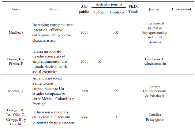 El presente documento es producto de una revisión bibliográfico-analítica de fuentes secundarias consultadas a través de las bases de datos: Redalyc, Dialnet, Scielo (en español), así como Science Direct y Taylor & Francis (en inglés). En estas bases de datos se utilizaron las siguientes claves de búsqueda: Para aquellas en español fueron [Competencias emprendedoras AND básica primaria AND niñez AND América Latina AND Europa AND Estados Unidos AND Educación AND programas de formación], y para las bases de datos en inglés se utilizaron [Entrepreneurship AND entrepreneurial competencies AND primary grades AND elementary school AND childhood AND Latin America AND Europe AND United States AND education]. A partir de los hallazgos obtenidos, finalmente se recopilaron ciento cuarenta y ocho (148) documentos académicos que daban cuenta de referentes teóricos, lineamientos y programas educativos en básica primaria dirigidos a la formación de competencias emprendedoras. Entre ellos, en la tabla 1 se relacionan los principales documentos que fundamentaron el análisis realizado.