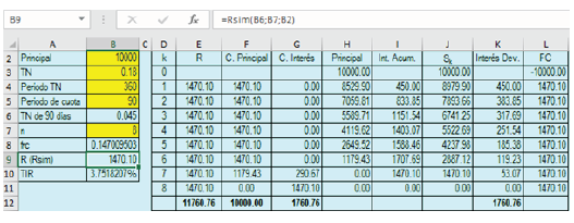 A manera de referencia, en la celda B10 de la figura 3 se calculó la TIR del préstamo, que arrojó una tasa efectiva trimestral TET = 0,037518207, con la cual se preparó la tabla de amortización del préstamo equivalente (figura 4), pero con interés compuesto.