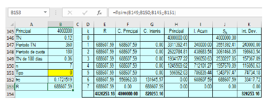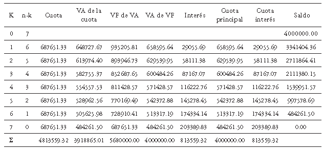 En contraste, al aplicar la fórmula 2 y la función financiera Rsim se obtiene la tabla de amortización, que se muestra en la figura 5. Observe que la cuota uniforme debe ser $688607,59 (figura 5) y no $687651,33 como se muestra en la tabla 5, y que los verdaderos intereses devengados por el préstamo ascienden a $820253,16. En este caso, el saldo de principal quedó cancelado en la sexta cuota, mientras que la última cuota correspondió exclusivamente a pago de interés.