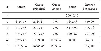 Es el saldo del préstamo inmediatamente después del vencimiento de cada cuota. Por ejemplo, inmediatamente después del vencimiento de la primera cuota, el saldo de 7236,53 um es la diferencia del saldo anterior y de la cuota que acaba de vencer: 10000 um-2763,47 um. Luego del pago de la última cuota este saldo debe ser cero, tal como se observa en la tabla 1.