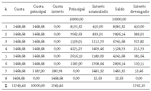 Al término del séptimo periodo (k=7), la cuota se aplica parcialmente a extinguir el saldo insoluto del principal ascendente a 1179,43 um, y lo restante ascendente a 290,67 um se aplica a disminuir parte del interés devengado por el préstamo.