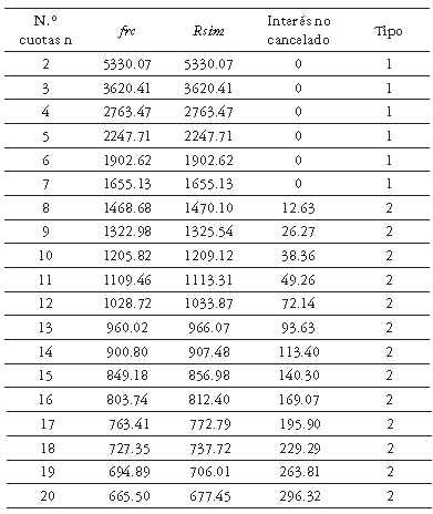 Sobre la base del problema anterior se hizo una simulación de los valores de n manteniendo los demás datos del ejemplo 3, cuyas cuotas uniformes fueron calculadas con el frc (fórmula 1) y con la función Rsim (fórmula 2). En la tabla 3 se observa que para valores de n que van desde 2 hasta 7 no hay diferencia en los importes de las cuotas calculadas con el frc o con Rsim, y en consecuencia corresponden al tipo 1.