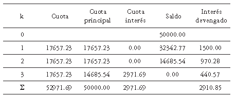 Al desarrollar la tabla de amortización con la cuota uniforme de 17657,33 um (tabla 4) se observa que los intereses del préstamo de 2971,69 um son mayores que los verdaderos intereses devengados de 2910,85 um. Con ello se comprueba que la supuesta ecuación de equivalencia financiera con fecha focal en el momento 0 no es la correcta para obtener el verdadero importe de la cuota uniforme en el modelo de estudio que corresponde a un régimen de interés simple. En su lugar debió utilizarse como fecha focal el final del horizonte temporal, como se muestra en la figura 1.